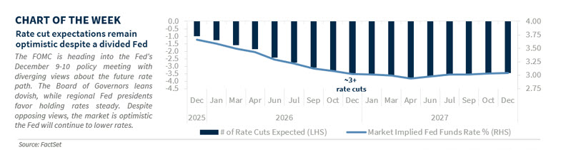 A hawkish 25 basis point cut, but a divided Fed: A 25 basis point rate cut at next week’s Fed meeting is all but certain—but don’t expect a unanimous vote. Recent dissents and diverging views point to an updated dot plot that will show an even wider dispersion, continuing a trend seen in recent years. In September’s projections, the median dot signaled just one more cut in 2026 and a return to neutral—around 3.0%—over the forecast horizon. We don’t anticipate major changes to that median view, but the growing gap between market pricing and the Fed’s expected rate path is a risk worth watching. Markets are leaning more dovish, pricing in nearly 60 basis points of additional cuts in 2026, as investors bet on a more accommodative Fed—especially with Hassett now the clear favorite to succeed Powell. Expect Powell’s press conference to frame next week’s move as a “hawkish cut,” emphasizing caution and “data dependence” even as rates come down.